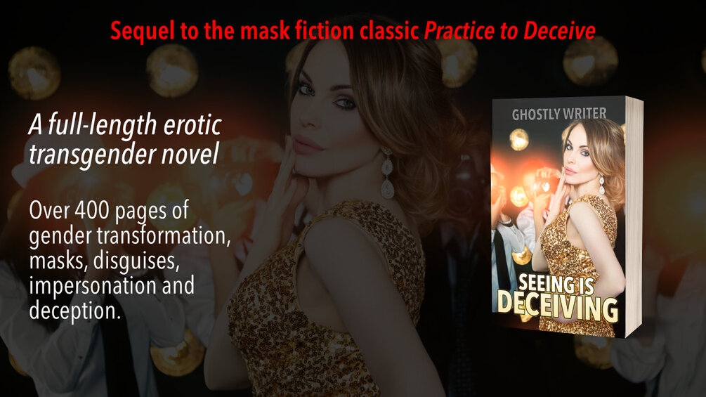 Seeing is Deceiving – the long-awaited sequel to Ghostly Writer’s mask fiction classic Practice to Deceive – is a full-length 135,000 word erotic transgender novel packed with gender transformation, masks, disguises, impersonation and deception.